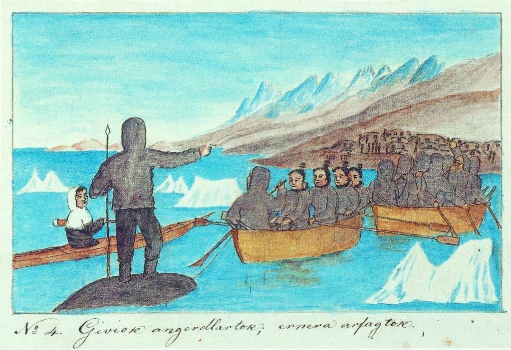 Akvarel af den grønlandske kunstner Aron fra ca. 1860. Akvarellen illustrerer sagnet om Kivioq. Sagnet handler om sagnfiguren Kivioq og den livslange rejse, som han begiver sig ud på i fortvivlelse over sin kones død. Han vender hjem til bopladsen som en gammel mand og ser som det første sin søn, der står på ryggen af en fanget hval. Som et grædende barn havde han forladt ham, han fandt ham igen som fanger, stående på en hval. Legenden er berettet af Peter Motzfeldt fra Julianehåb, og sagnet ledsages af fire akvareller af Aron.